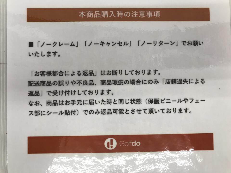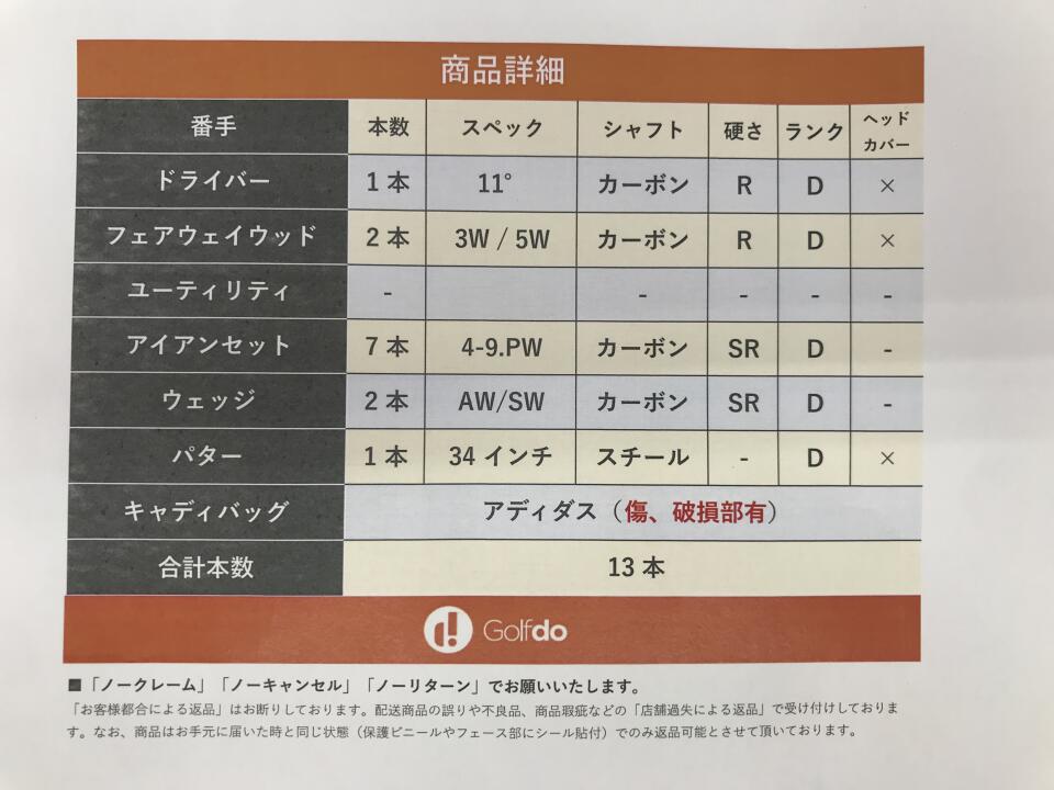 | 店舗からの コメント | アイアンヘッド錆有り。キャディーバッグ傷、破損部あり。 | ||
