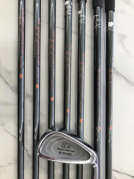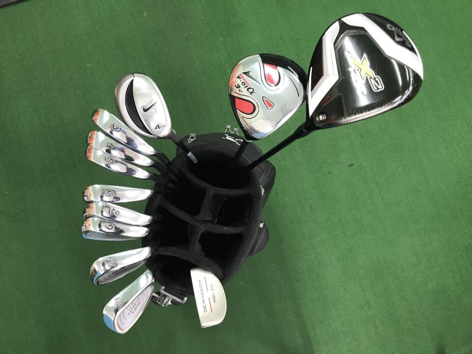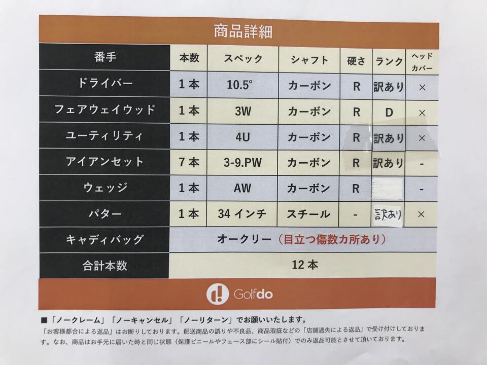ドライバーのスリーブに傷、若干の変形有り。4Uのクラウンに数ヶ所凹みあり。7アイアン無し。パターのヘッドとシャフトに錆有り。キャディーバッグ目立つ傷多数有り。 | ||