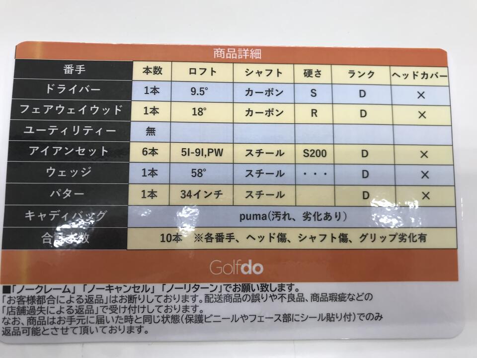 各番手、ヘッド、ソール、クラウン、バックフェース傷、塗装欠け有り、シャフト傷、グリップ劣化有り | ||
