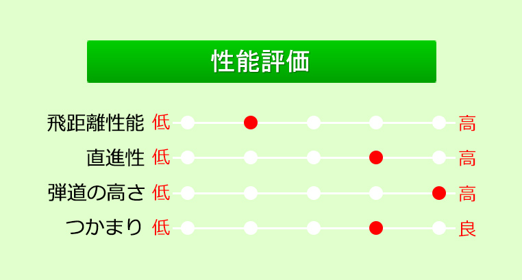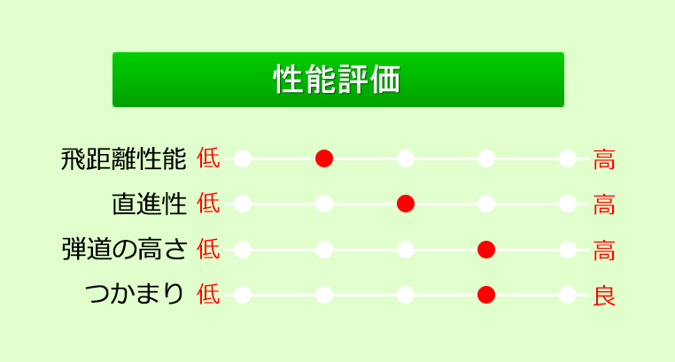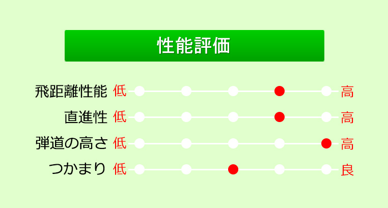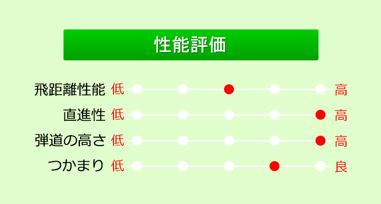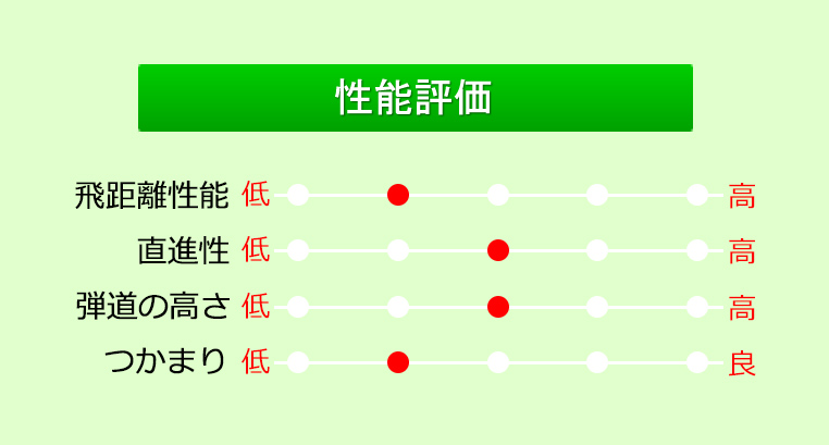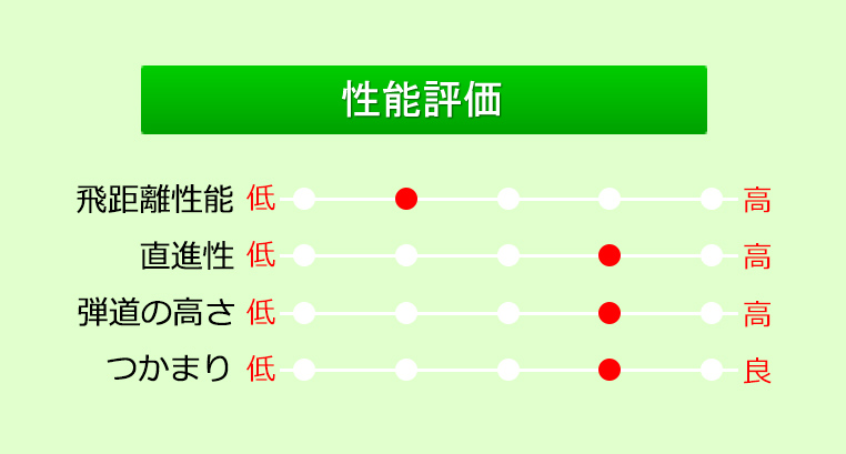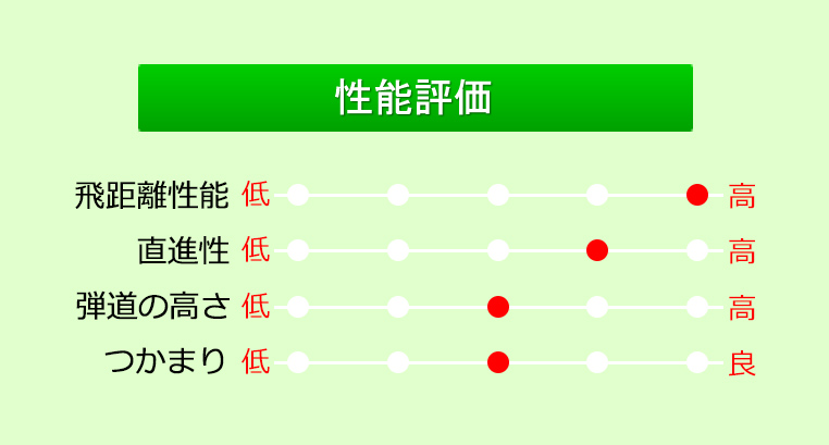 飛距離性能は標準的ながらスピン量が多めなのでユーティリティとしてはグリーンを狙いやすい。目立つ性能ではないが、やさしくグリーンを狙えるので使ってみるとスコアアップに繋がりやすい。
